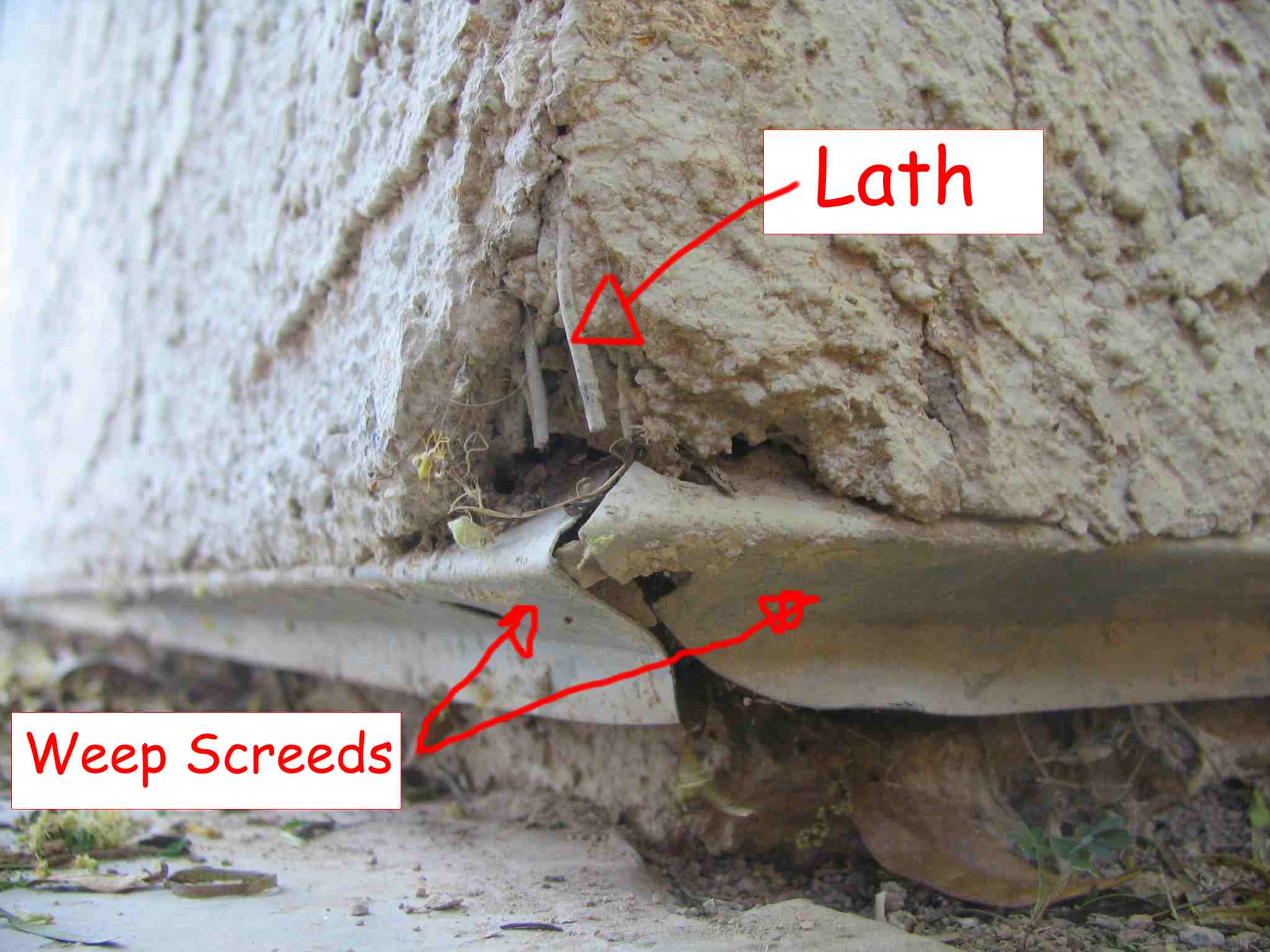 There they are...a pair of weep screeds forming the bottom of the walls meeting at this corner. Note that the metal lath that holds the stucco in place is also visible.